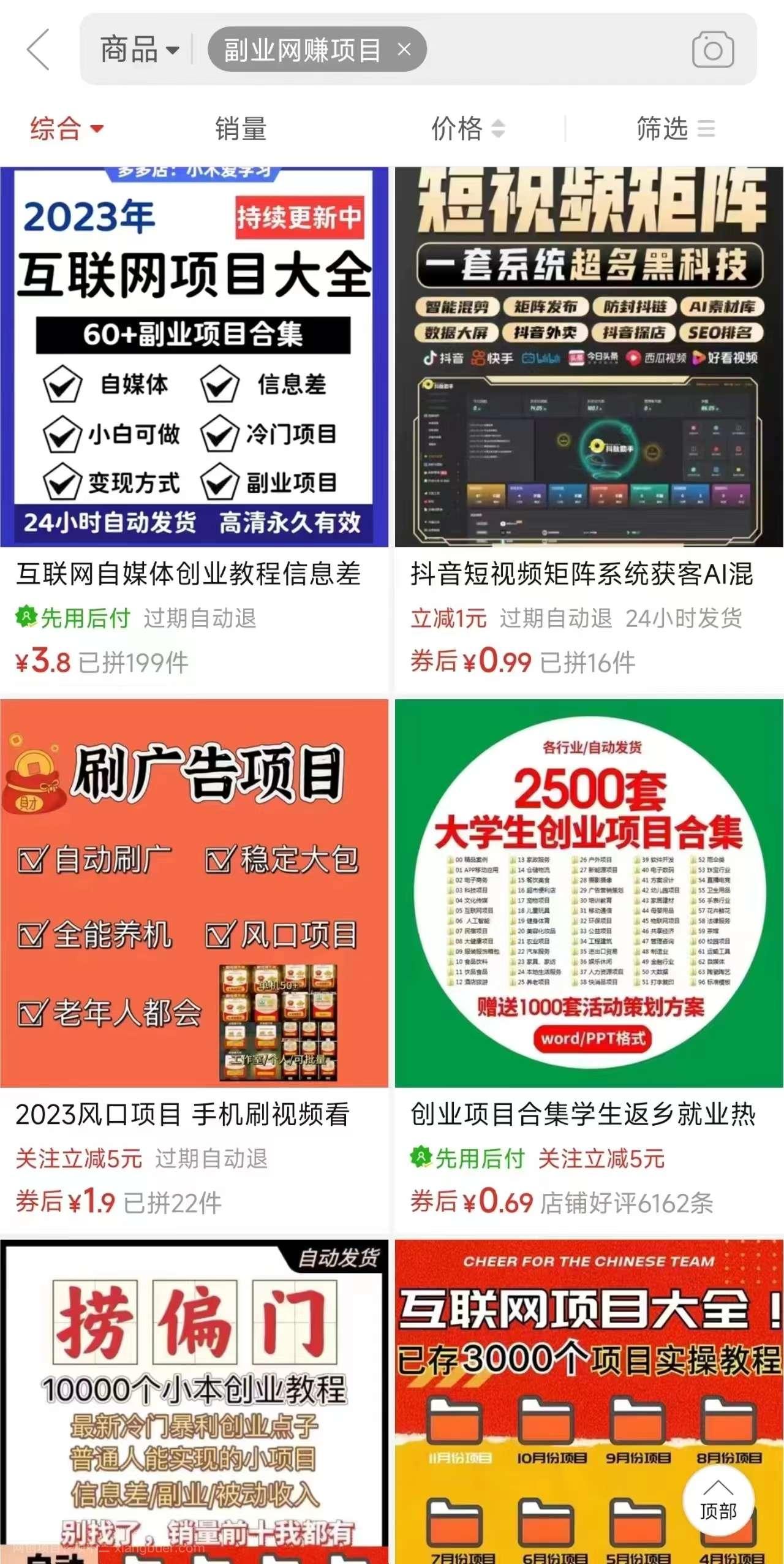 我们先讲第一种玩法,开店,这里指的是开一个虚拟资料店。无论在淘宝还是多多,随便一搜什么副业项目,无人直播等等的就会出来很多种商品,这些商品都是一些课程教程,也就是我们说的虚拟资料。