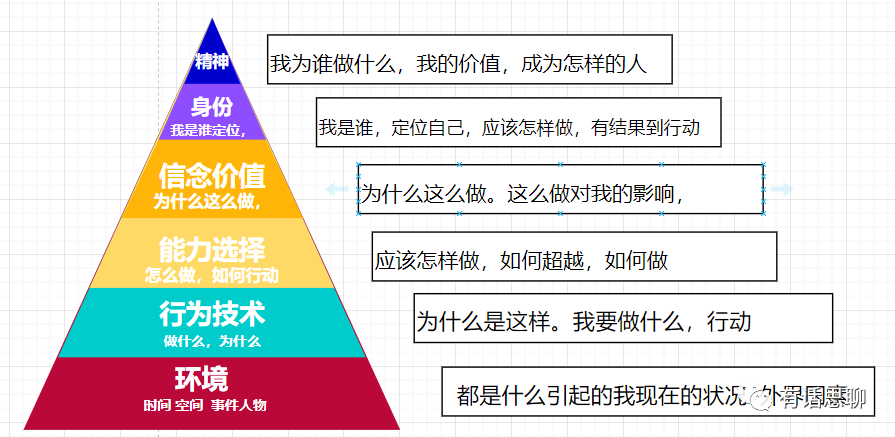 这个模型是一个自上而下的思考逻辑模型。它从愿景和使命出发,逐步向下考虑自己的身份、目标、信念、技术、人员和环境等方面。