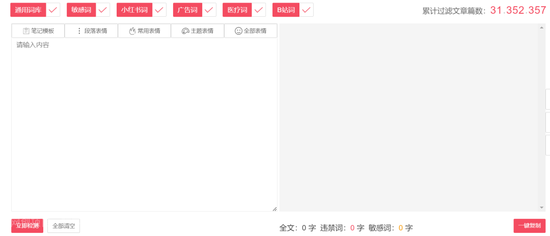 这是一款违规词、敏感词、广告词查询工具,对于运营自媒体或者推广人员必备,我每次写好文案以后,都会放到这个功能里面查询一下,