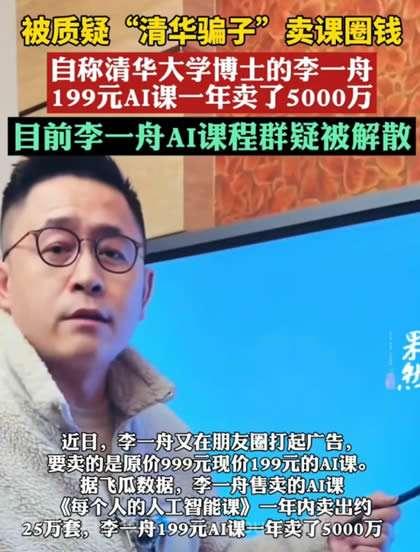 可能有的人认识李一舟,这里简单发个简介:识右手边这位的,他叫李一舟,自称清华博士,在抖音迅速走红吸引了百万粉丝。然后就推出了199元的Al课程,一个月内销售了4000万营业