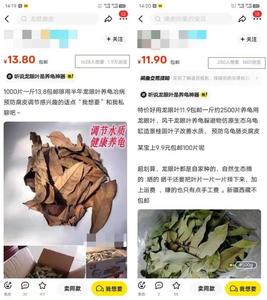 后面我还去其他自媒体平台查看了一下,才发现这些叶子都是卖给养龟的,反正是说用这个龙眼叶养龟效果好,以下是一个说明图。