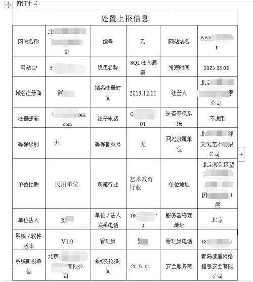 限期整改报告写完后,要填写处置上报信息,包括域名,公司名称,备案号,域名注册地址,服务器所在地,法人,联系方式,防火墙类型,等保备案号,隐患名称,网站所属行业以及单位性质,网站管理员,联系电话,网站系统的研发时间等等都要详细的填好后,将盖章好的限期整改通知书扫描件、整改报告、处置上报信息等3个文件回传给网安那面,有些地区可以发送邮件,有些需要去现场提交纸质版本,具体就是这样的一个解决过程。