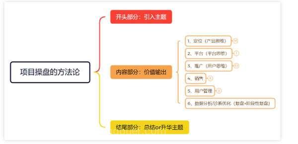 开头部分:引入主题。内容部分:价值输出。结尾部分:总结or升华主题。具体的大家可以参考以下的思维导图,这是之前给大家分享过关于互联网项目操盘方法论的文章,在写这篇文章之前,老谢我就使用了思维导图进行文章框架化的梳理: