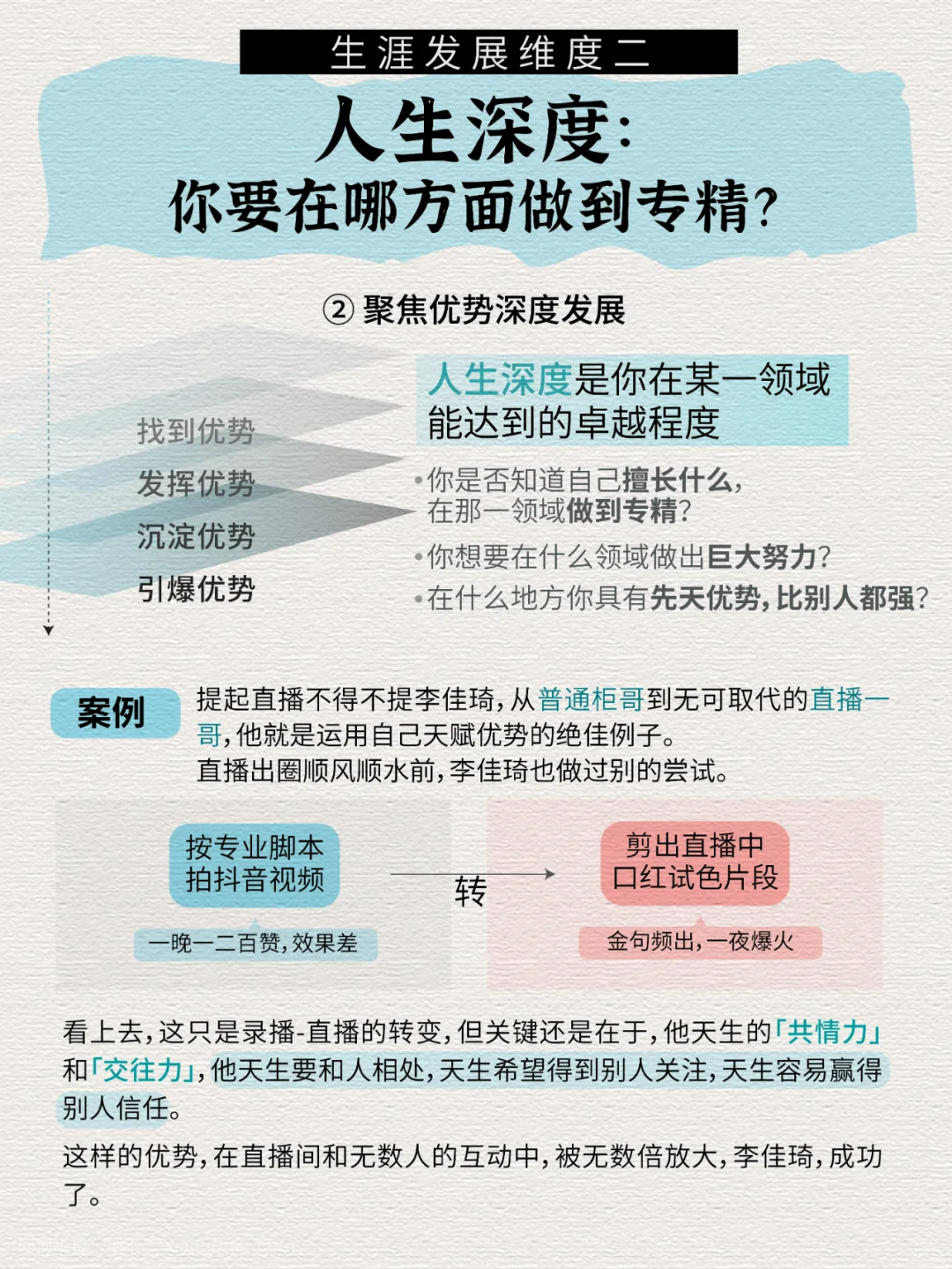 二、深度是指我们在某一领域或技能上的卓越程度。发挥优势,在某一领域达成卓越,是实现深度发展的关键。每个人都有自己的天赋和优势,我们需要找到自己的优势所在,并不断深耕细作,使之成为我们的核心竞争力。当我们在某个领域达到卓越时,就会获得他人的认可和尊重,也会更加自信和满足。
