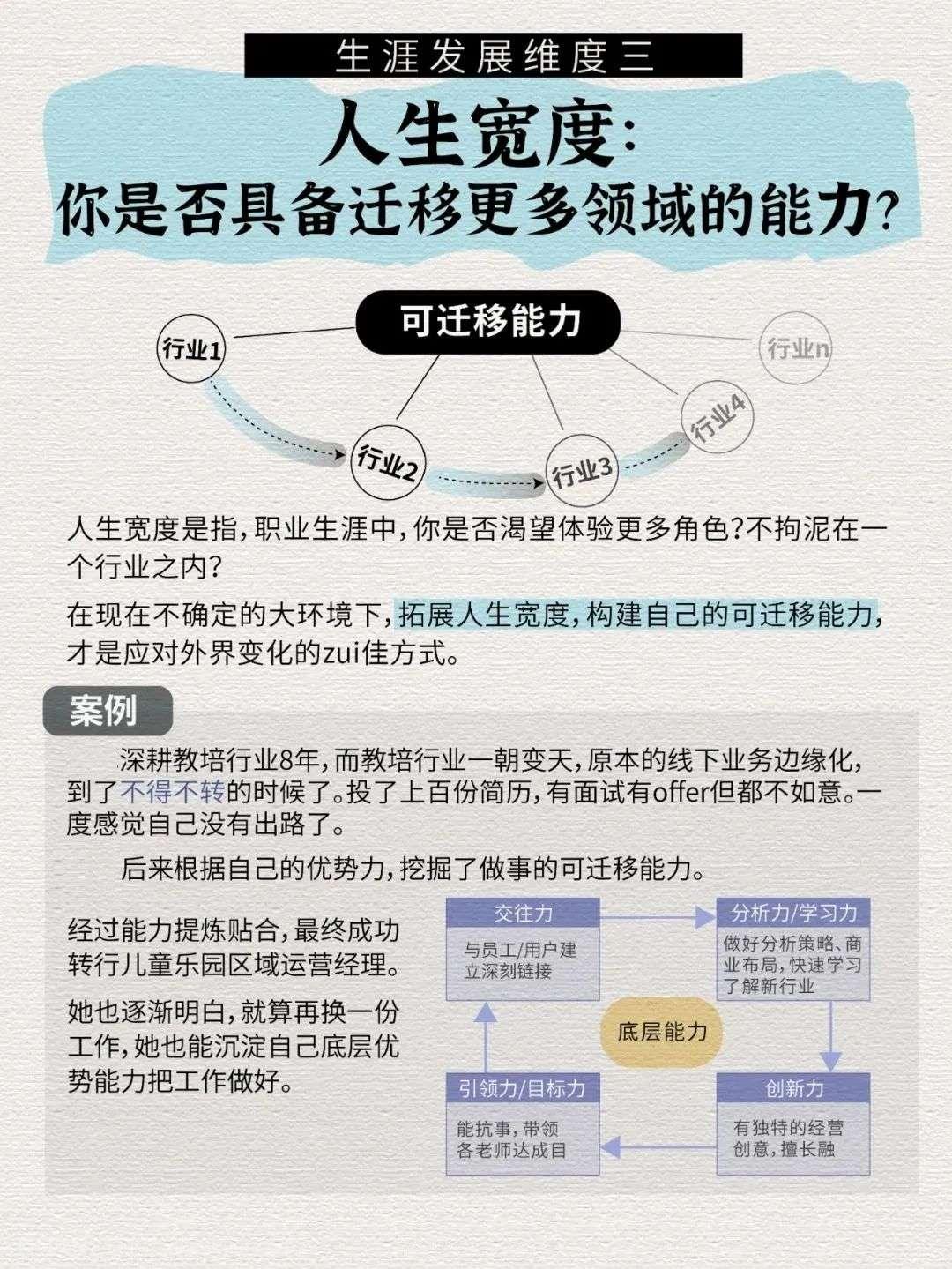 三、宽度是指我们构建可迁移能力,运用优势在当下获得确定的自我。在这个快速变化的时代,单一的技能或知识已经无法满足我们的需求。我们需要具备跨领域、跨行业的可迁移能力,才能应对各种挑战和机遇。通过不断学习和实践,我们可以拓展自己的能力和视野,让自己变得更加全面和多元。