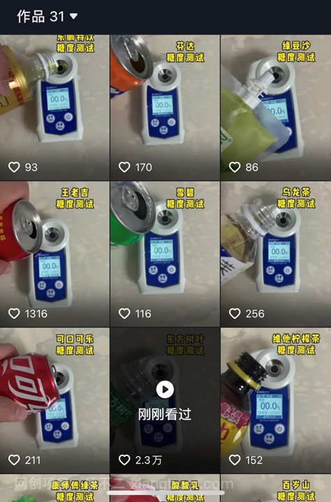 每个视频都是用不同的饮料进行糖度测试,而且播放量也非常可观。