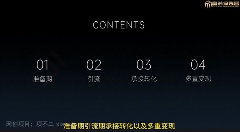 项目四个阶段的划分,准备期引流期承接转化以及多重变现