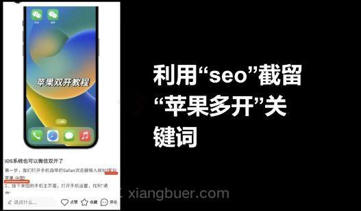 它是利用SEO截流苹果多开的关键词,小红书平台里面他们是截流了iOS系统多开、微信多开、微信双开这些关键词,然后你去搜索这个关键词你就能够看到有很多的人都在做,然后你会发现他们的发布地址要么就是山东要么就是江苏,因为现在做这个项目只有这么两家就是他们在做,然后再利用中文域名做中转流量的转接。
